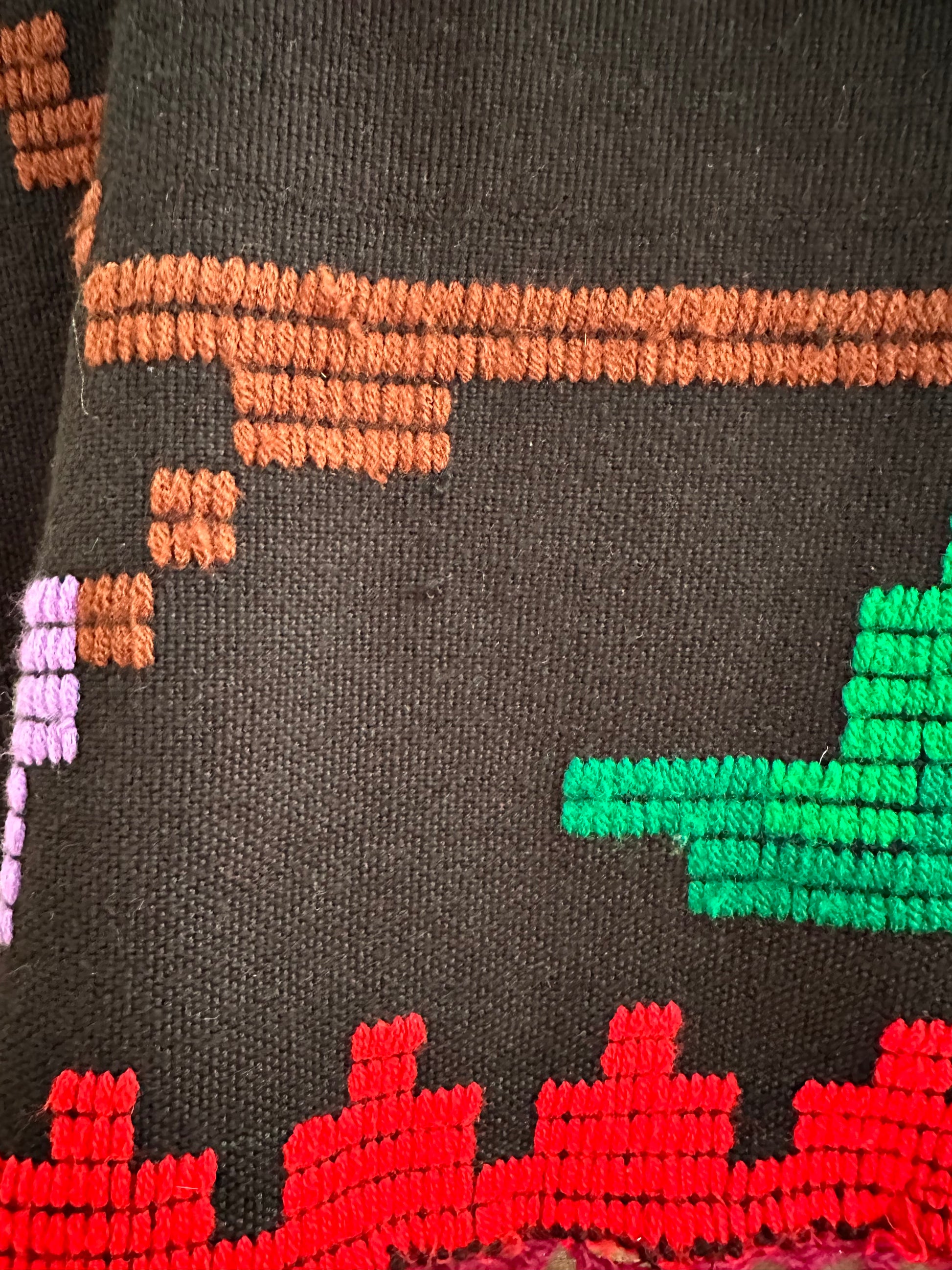 色とりどりの毛糸でお花がハンドステッチされています